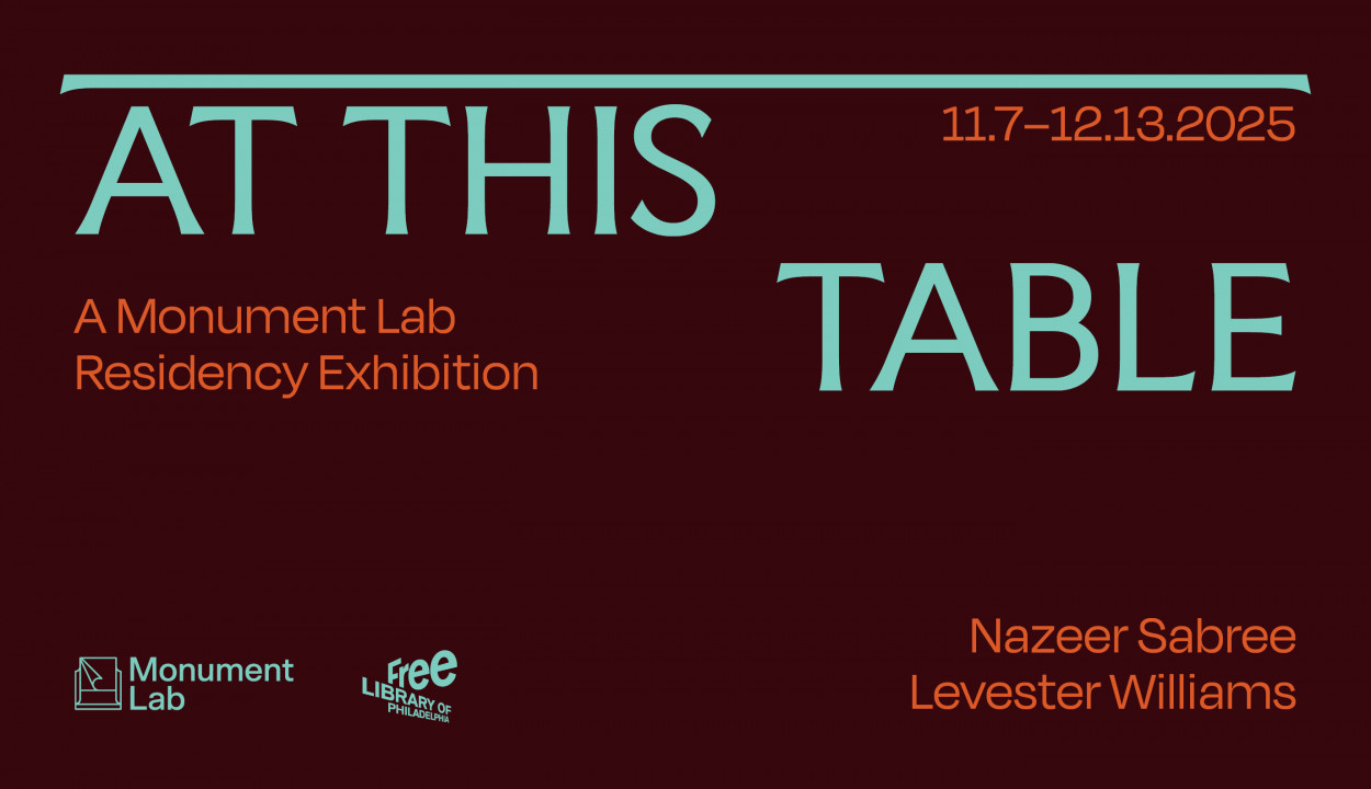 At This Table: A Monument Lab Residency Exhibition marks the culmination of the 2025 Monument Lab Residency, presenting new monumental prototypes by Philadelphia-based artists-in-residence Nazeer Sabree and Levester Williams. The exhibition’s title, drawn from Joy Harjo’s poem “Perhaps the World Ends Here,” centers the kitchen table as a site of gathering and exchange, where we come to understand who we are and how we connect to one another.